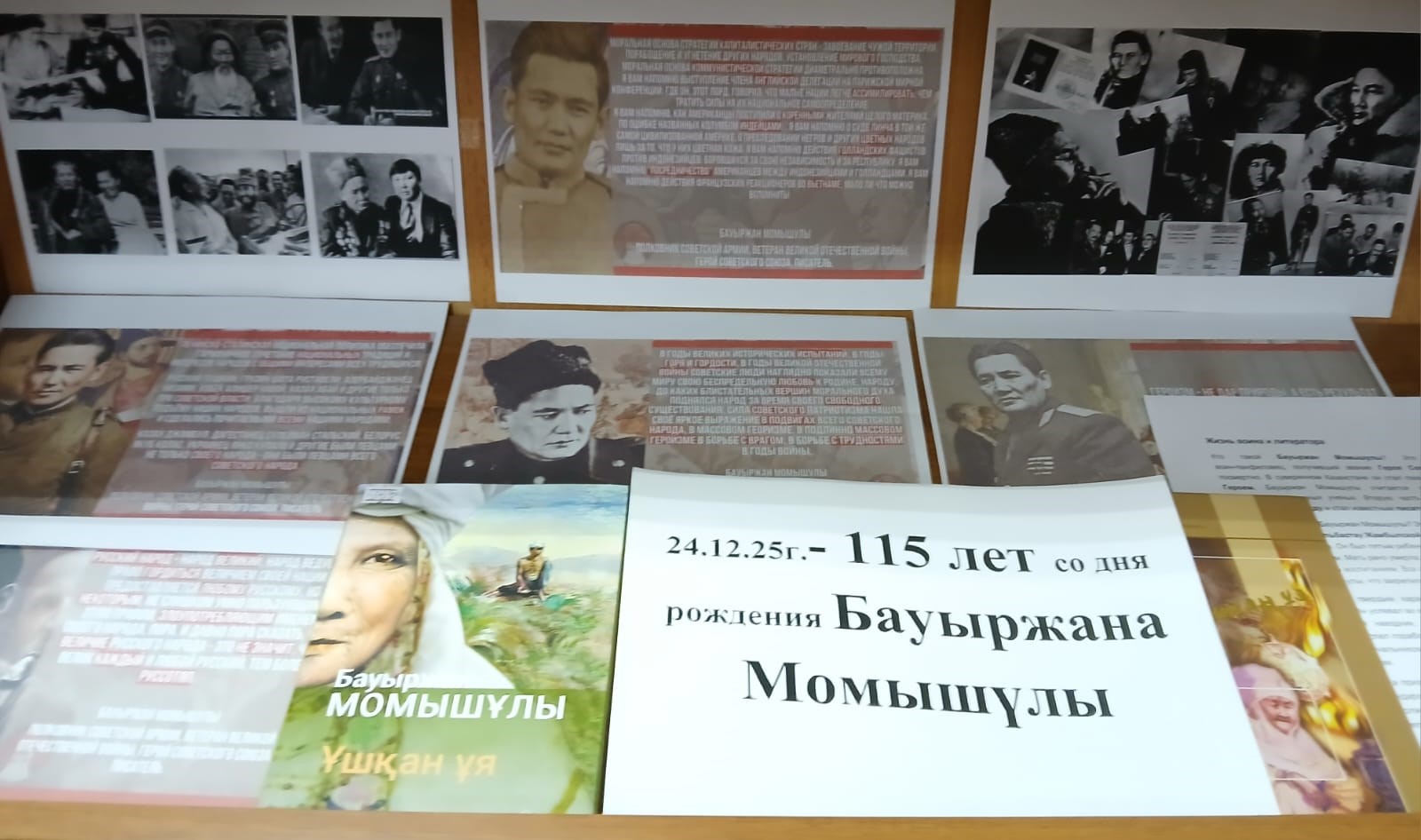 Кеңес Одағының Батыры, панфиловшы және жазушы Бауыржан Момышұлы. Атаулы мерейтой күніне орай "Жоғары Қазақ гуманитарлық - техникалық колледжі" кітапханасының оқу залында "Аңызға айналған батыр" кітап көрмесі - шолу рәсімделді.