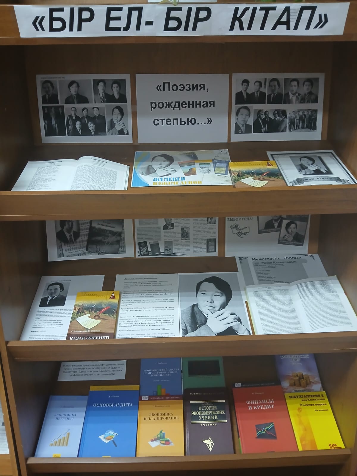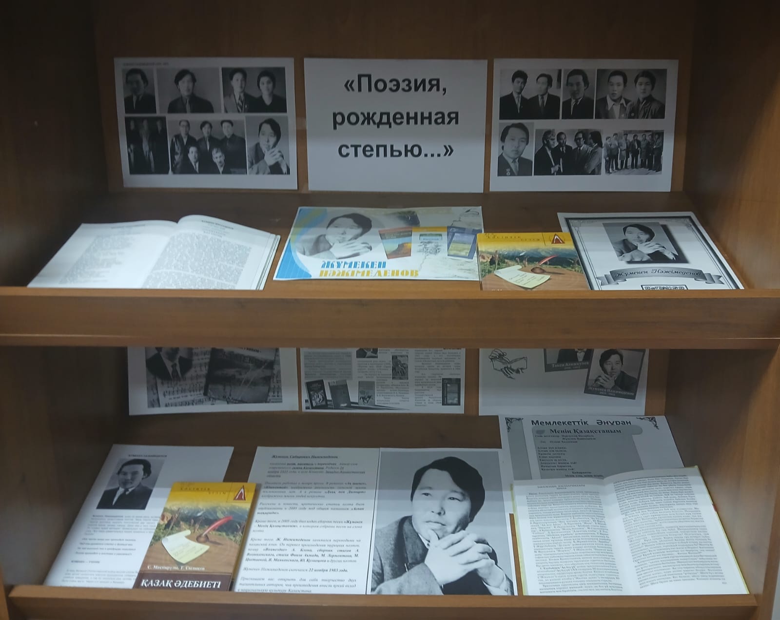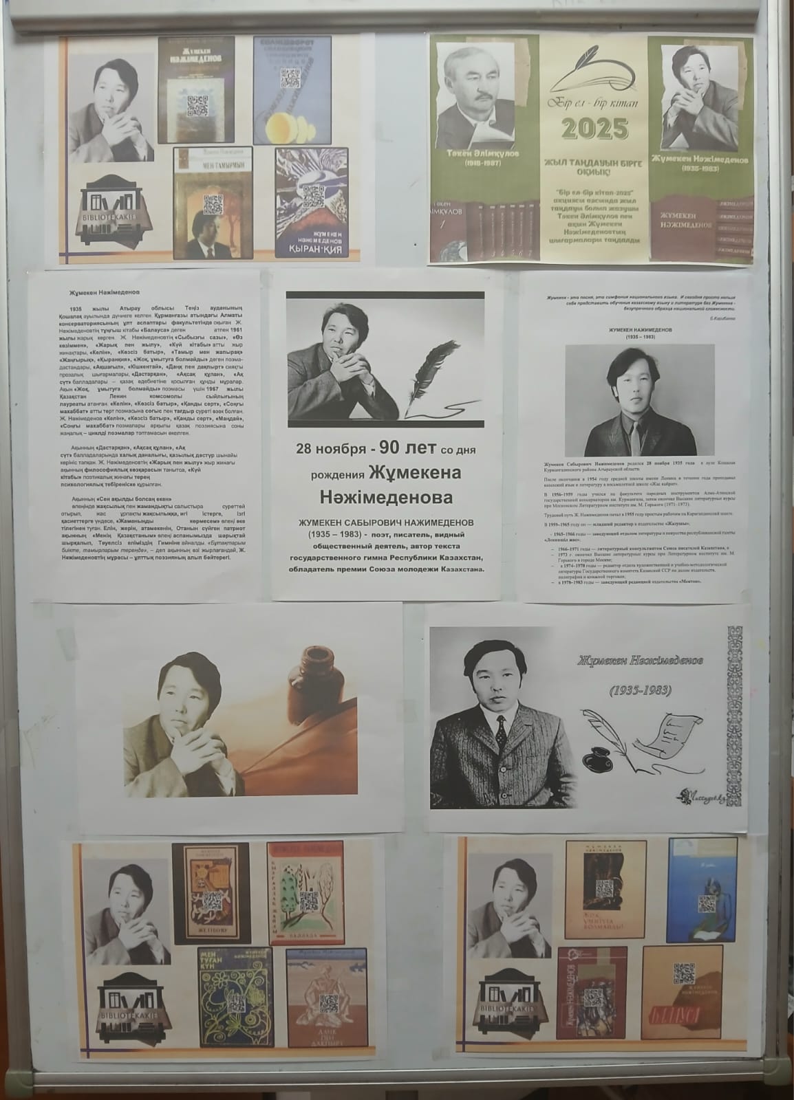 Жоғары Қазақ гуманитарлық-техникалық колледжі кітапханасының оқу залында белгілі қазақ ақыны, жазушысы, аудармашысы, Мемлекеттік сыйлықтың лауреаты, Қазақстан әнұранының авторы Жұмекен Нәжімеденовтің туғанына 90 жыл толуына (1935-1983) арналған портрет - кітап көрмесі ашылды.