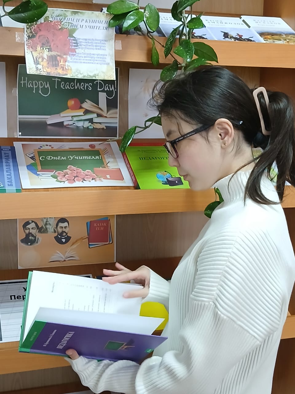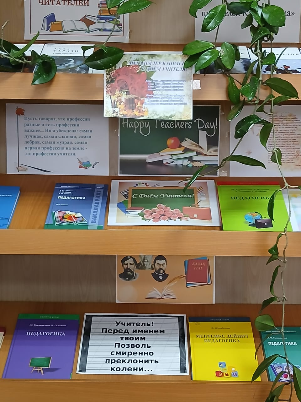 В честь этого знаменательного события в читальном зале библиотеки «Высшего Казахского гуманитарно – технического колледжа» организована книжно-иллюстративная выставка «Учитель! Пред именем твоим ...»
